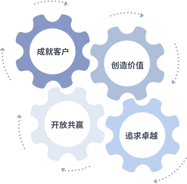 成就客户是一切决策的出发点,创造价值是衡量所有工作的标准,追求卓越是我们做事做人的态度,开放共赢是我们的格局也是最终的结果。价值观的齿轮环环相扣,推动着组织里的每个人不断向前。